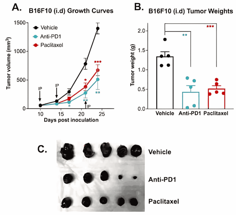 Immune Checkpoint Inhibitor and Chemotherapy Validation in Melanoma B16F10 orthotopic Tumor Model. 0.5 x106 B16F10 mouse melanoma cells were intradermally injected into the rear flank of C57B6 mice. Once the tumor size reached 50~100mm3, mice were randomized into groups and treated with vehicle anti-PD-1 antibody (12.5 mg/kg IP), or paclitaxel (20 mg/kg IP). Tumor volume was monitored twice per week using calipers. Both anti-PD1 antibody and paclitaxel significantly depressed tumor growth ( Arrows indicate date of treatment; both p<0.001; Data are mean ± SEM; n=5 for each group).